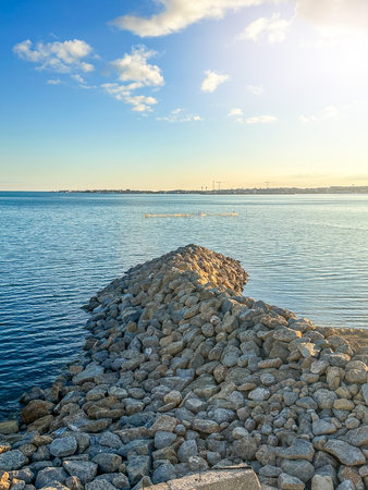 A breakwater made of large stones stretches into clear blue water providing protection to the shore Sunlight reflects off the gentle waves creating a peaceful coastal atmosphere.