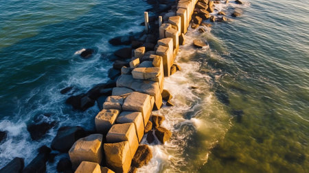 Aerial drone view of a breakwater. breakwater in the sea, a collection of concrete breakers
