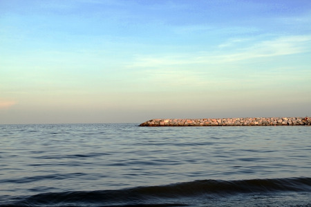Breakwater against colorful sunset sky. Stunning seascape. Golden sunset light through the blue clouds. Long exposure. Baltic sea, Riga bay, Latvia