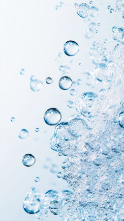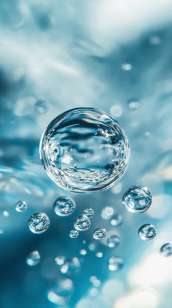 Close-up of clear water bubbles floating on an aquatic blue background, creating a calming and refreshing visual ideal for wellness and purity themes.