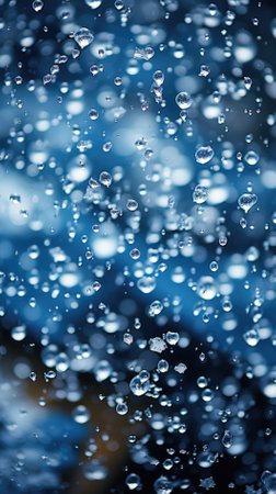 A close-up of water, droplets against a bokeh, background, showcasing the delicate and mesmerizing beauty of water in motion.