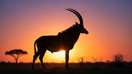 Ungulate showing sable antelope silhouette with large curved horns against african sunset keywords: sable...