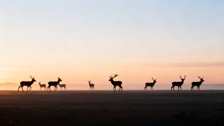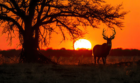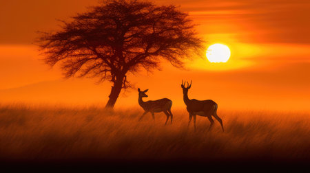 Breathtaking sunset silhouette of a herd of deer gazelles and antelopes in a natural African landscape This tranquil and serene scene captures the beauty and wonder of the wild outdoors
