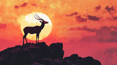 A stunning silhouette of an antelope stands proud on rocky terrain as a vibrant sunset bathes the landscape in warm hues, evoking feelings of tranquility.