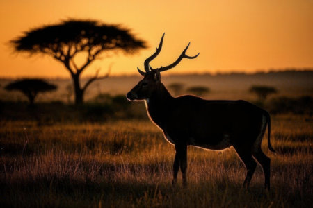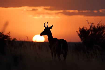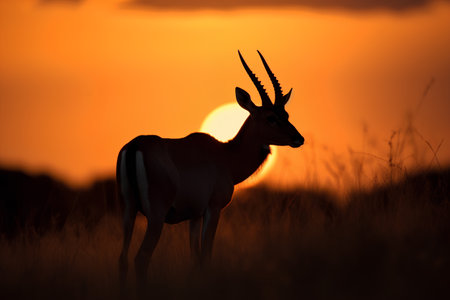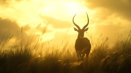 A stunning silhouette of an antelope stands gracefully against a golden sunset in a vast grassland, capturing the essence of wild beauty and tranquility.