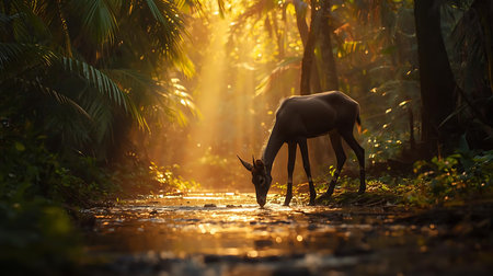 Elusive Saola, also known as the Asian unicorn, gracefully navigating a lush, untouched forest