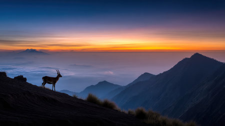 A deer stands silhouetted on a mountain ridge, set against a vibrant sunset sky with hues of orange and blue. The composition features rolling mountain peaks and low-lying mist, suggesting a high-altitude environment. The image is suitable for various commercial purposes, including illustrative and editorial use.