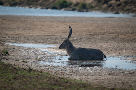 Male common waterbuck lies in shallow pool