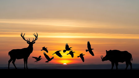 Silhouette of a wild boar with a flock of birds at sunset