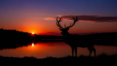 Silhouette of a red deer stag at sunset on a lake