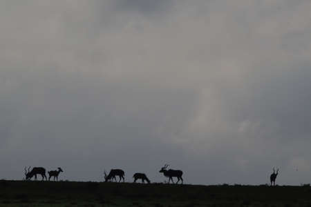 Silhouette of kudus, an antelope species of African, on the ridge against the grey morning sky in Addo Elephant National Park, South Africa.