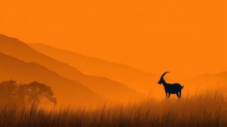A lone goat stands silhouetted against a vibrant orange sunrise, set against rolling mountains. This serene landscape captures the beauty of nature and tranquility.