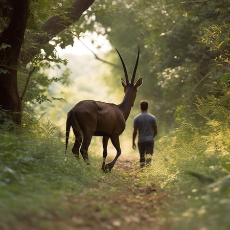 An AI generated illustration of A man is walking through a lush forest, leading a young deer by a leash
