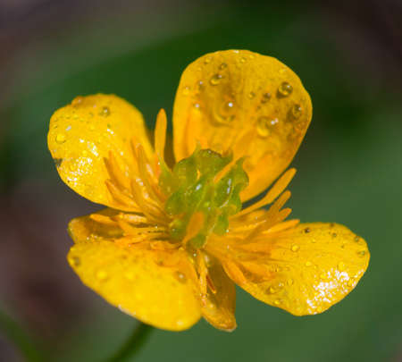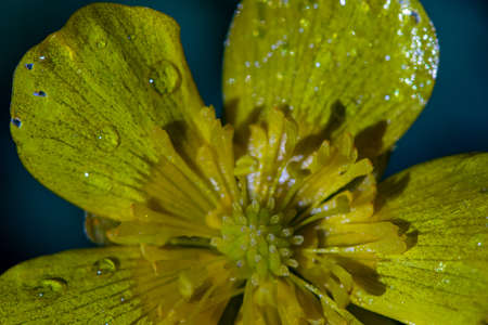 Macro view of dew drops on yellow flower. Ranunculus repens.