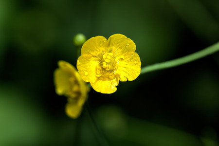 Flower of Tall Buttercup or Ranunculus acris macro with bokeh background, selective focus, shallow DOF.