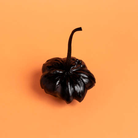 Creative layout made with black pumpkin on the orange background. Minimal Halloween or Thanksgiving concept. Flat lay.