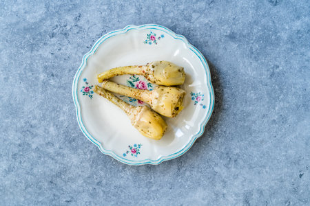 Marinated Spicy Artichoke Hearts in Olive Oil served with Root. Ready to Eat.