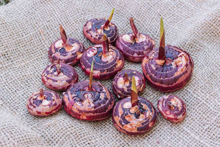 Sprouting tulip bulbs. Flower tubers with roots for planting in the ground.