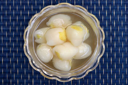 Homemade dessert in Thai style, Peeled rambutan stuffed with pineapple in syrup in crystal bowl on blue placemat background.