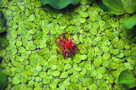 Beautiful Spirodela polyrhiza or duckweed floating on the water. Red barringtonia asiatica flower in the middle of great duckweed, water cabbage and water fern.