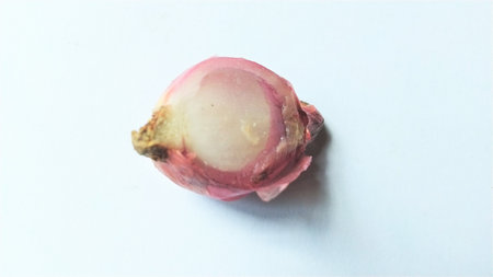 A fresh peeled pink onion bulb is isolated on a bright white background with soft lighting for clean food preparation concepts and healthy eating themes.
