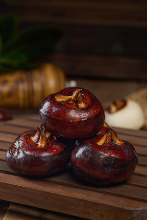 Local Indonesian fruits names Jambu Air or Red Water Guava ,placed on brown wooden background