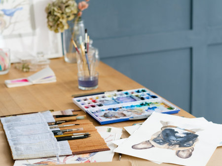 Artistic equipment in studio: sketch pad on table, paint brushes, paints. Copy space for text.