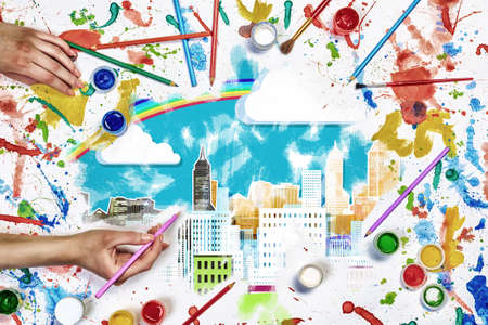 Top view of people hands drawing urban concept with paints