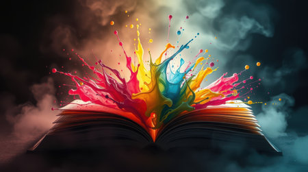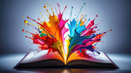 Dynamic image of colorful paint splashes bursting from the pages of an open book