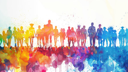 A visually striking artwork featuring multicolored spectrum silhouettes of diverse people, rendered in a soft watercolor style on a clean white background. Ideal for themes of unity, diversity,