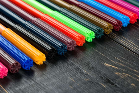 Back to school and offices stationary concept, stack of colored pens markers on wooden desk