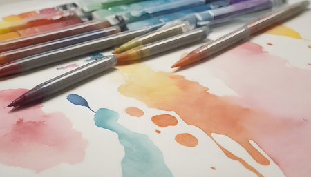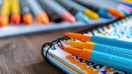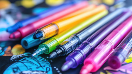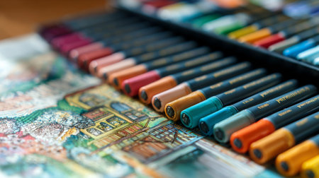 A close-up view of colorful markers arranged neatly beside a vibrant drawing, capturing the essence of creativity and artistic expression in a bright workspace atmosphere.