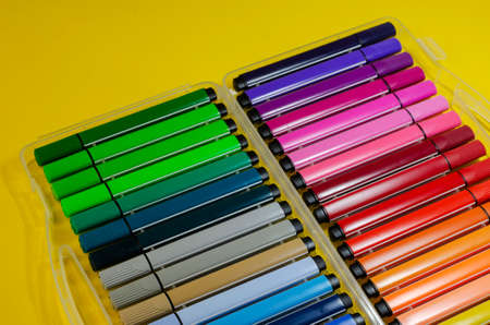 Felt pens for drawing on a yellow background with place for text. Stationery store.