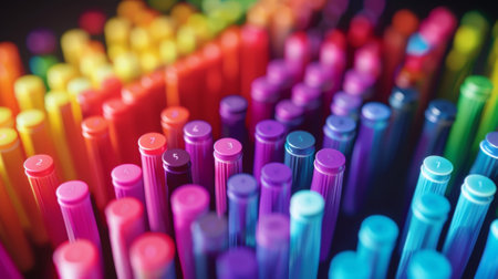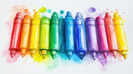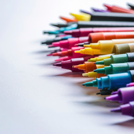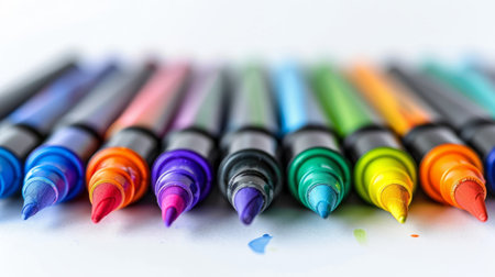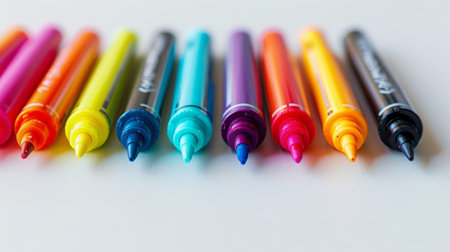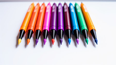 a vibrant array of colored markers, neatly aligned on a white surface AI generated