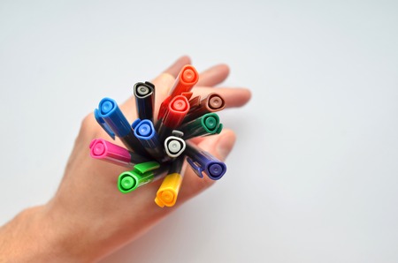 Large group of colorful drawing markers for sketching holds in hand, on the white background