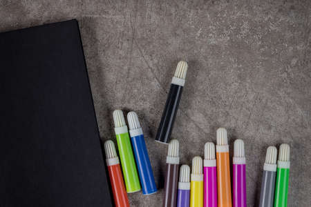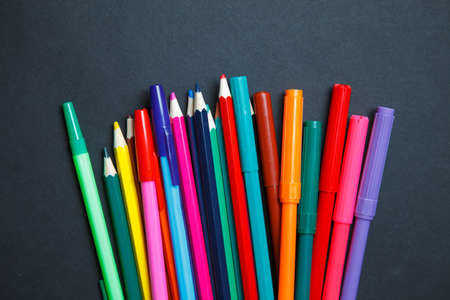 Colorful markers on a dark background. Concept of education, learning, creative and arts and crafts.