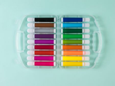 Large set of colorful felt-tip pens for drawing on a colored background. Plastic box with markers of different colors and shades. Selective focus.