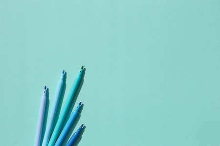 Colored felt tip pens composition on blue background. Flat lay, layout and tabletop mockup with copy space.