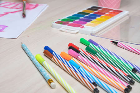 A set for childrens creativity and development. felt-tip pens, colored paper on the table.