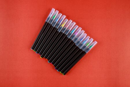 multi-colored gel pens, pencils and notebook lie on the table, concept, selective focus