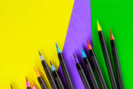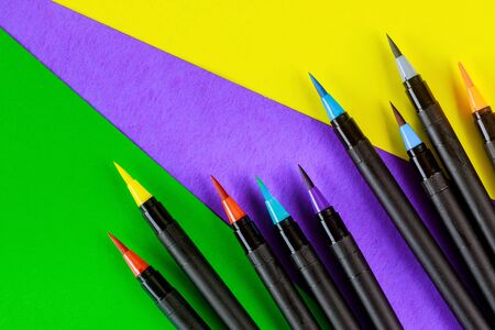 Multi-colored stationery felt-tip pens and brushes on a background of multi-colored cardboard paper.