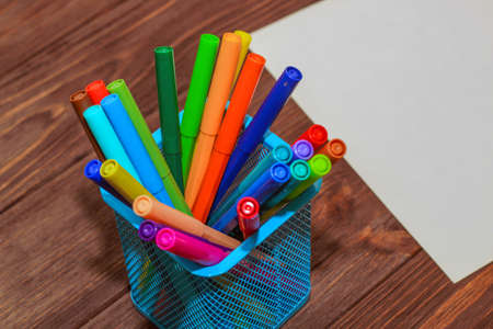 School creative flatley. On a wooden table are multi-colored felt-tip pens and a sheet with empty space for text.