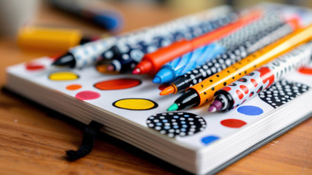 Capture the essence of creativity with this vibrant arrangement of colorful pens resting on a polka-dotted notebook, perfect for artistic endeavors.