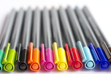 Set of new colorful felt-tip pens on white background. Seven brightly colored felt-tip pens. Creativity, drawing, home entertainment concept. Selective Focus.