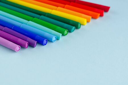 Set of colourful drawings markers. Different labeled colors. Top view. Selective focus. Copy space on light blue backgroung on top.