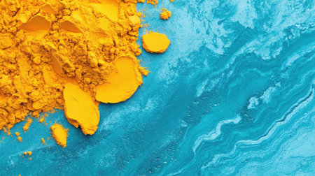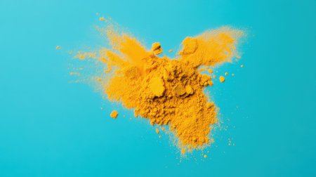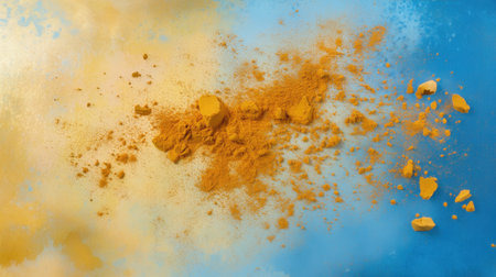 Explore the vibrant colors and textures of turmeric powder, beautifully scattered across a blue and yellow background, ideal for culinary and health themes.