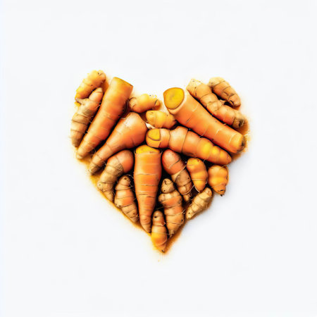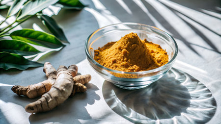 A beautifully arranged bowl of golden turmeric powder surrounded by fresh turmeric roots and herbs, showcasing vibrant colors perfect for cooking and wellness.