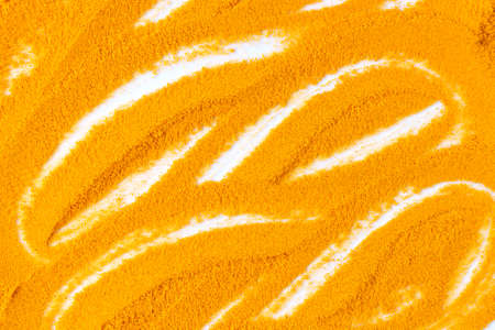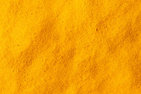 Turmeric powder texture. Background with copyspace. Close up. Top view