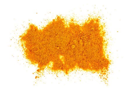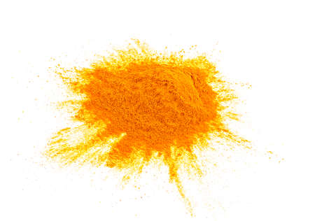 Orange turmeric powder is scattered on a white background. Natural, useful healing spice from the East. Turmeric