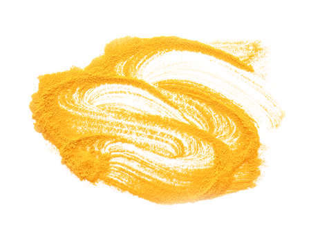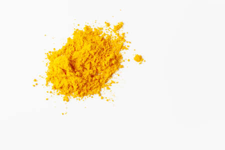 Dry turmeric powder on a white background. Curcuma domestica powder. viewed from above.